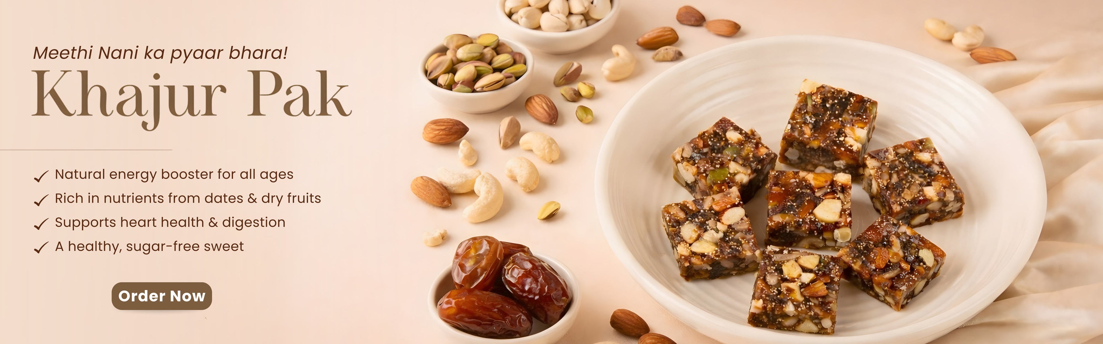 Our Signature: The Khajur Pak, our journey starts with our beloved Khajur Pak. It’s more than just a sweet; it’s a nutritional powerhouse crafted for the modern lifestyle. Every bite is a rich blend of: